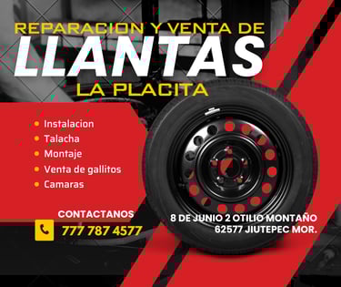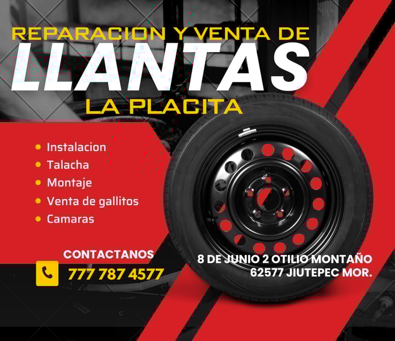 Tu auto merece lo mejor. 🚗✨ En la placita, nos especializamos en la reparación y venta de llantas de alta calidad. Desde una simple pinchadura hasta llantas nuevas, tenemos la solución perfecta para tu seguridad en el camino. 8 de Junio 2 Otilio Montaño 62577 Jiutepec 📞 777 787 4577
